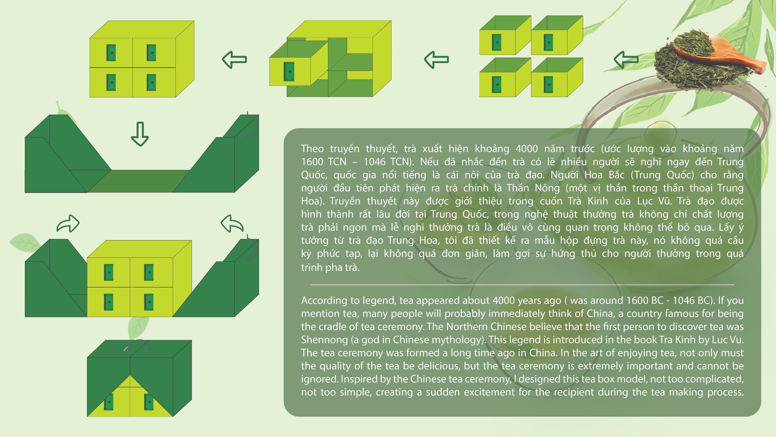 Theo truyền thuyết, trà xuất hiện khoảng 4000 năm trước (ước lượng vào khoảng năm 1600 TCN – 1046 TCN). Nếu đã nhắc đến trà có lẽ nhiều người sẽ nghĩ ngay đến Trung Quốc, quốc gia nổi tiếng là cái nôi của trà đạo. Người Hoa Bắc (Trung Quốc) cho rằng người đầu tiên phát hiện ra trà chính là Thần Nông (một vị thần trong thần thoại Trung Hoa). Truyền thuyết này được giới thiệu trong cuốn Trà Kinh của Lục Vũ. Trà đạo được hình thành rất lâu đời tại Trung Quốc, trong nghệ thuật thưởng trà không chỉ chất lượng trà phải ngon mà lễ nghi thưởng trà là điều vô cùng quan trọng không thể bỏ qua. Lấy ý tưởng từ trà đạo Trung Hoa, tôi đã thiết kế ra mẫu hộp đựng trà này, nó không quá cầu kỳ phức tạp, lại không quá đơn giản, làm gợi sự hứng thú cho người thưởng trong quá trình pha trà.