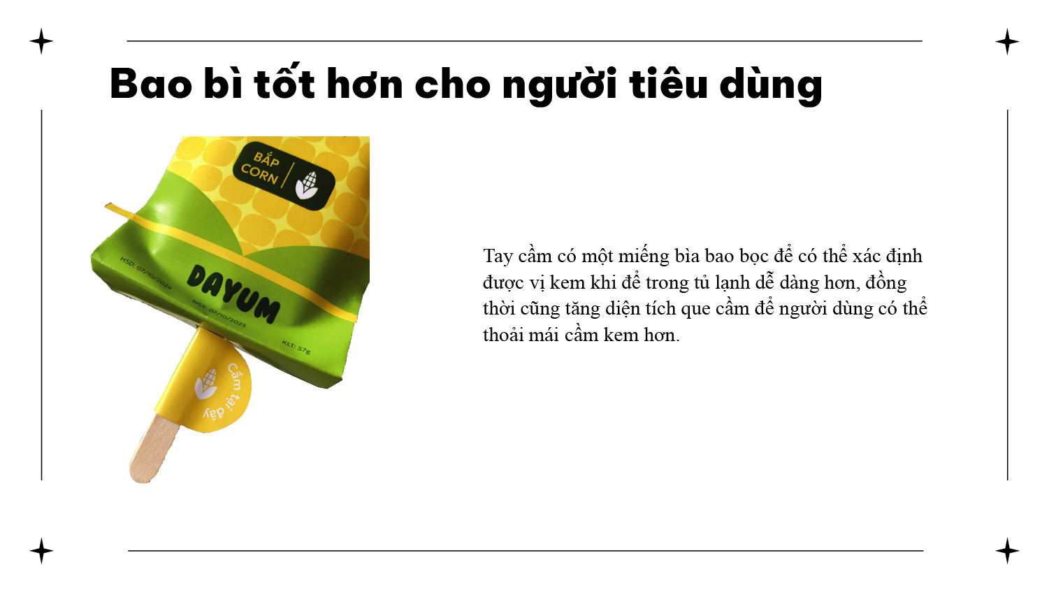 Tay cầm có một miếng bìa bao bọc để có thể xác định được vị kem khi để trong tủ lạnh dễ dàng hơn, đồng thời cũng tăng diện tích que cầm để người dùng có thể thoải mái cầm kem hơn.