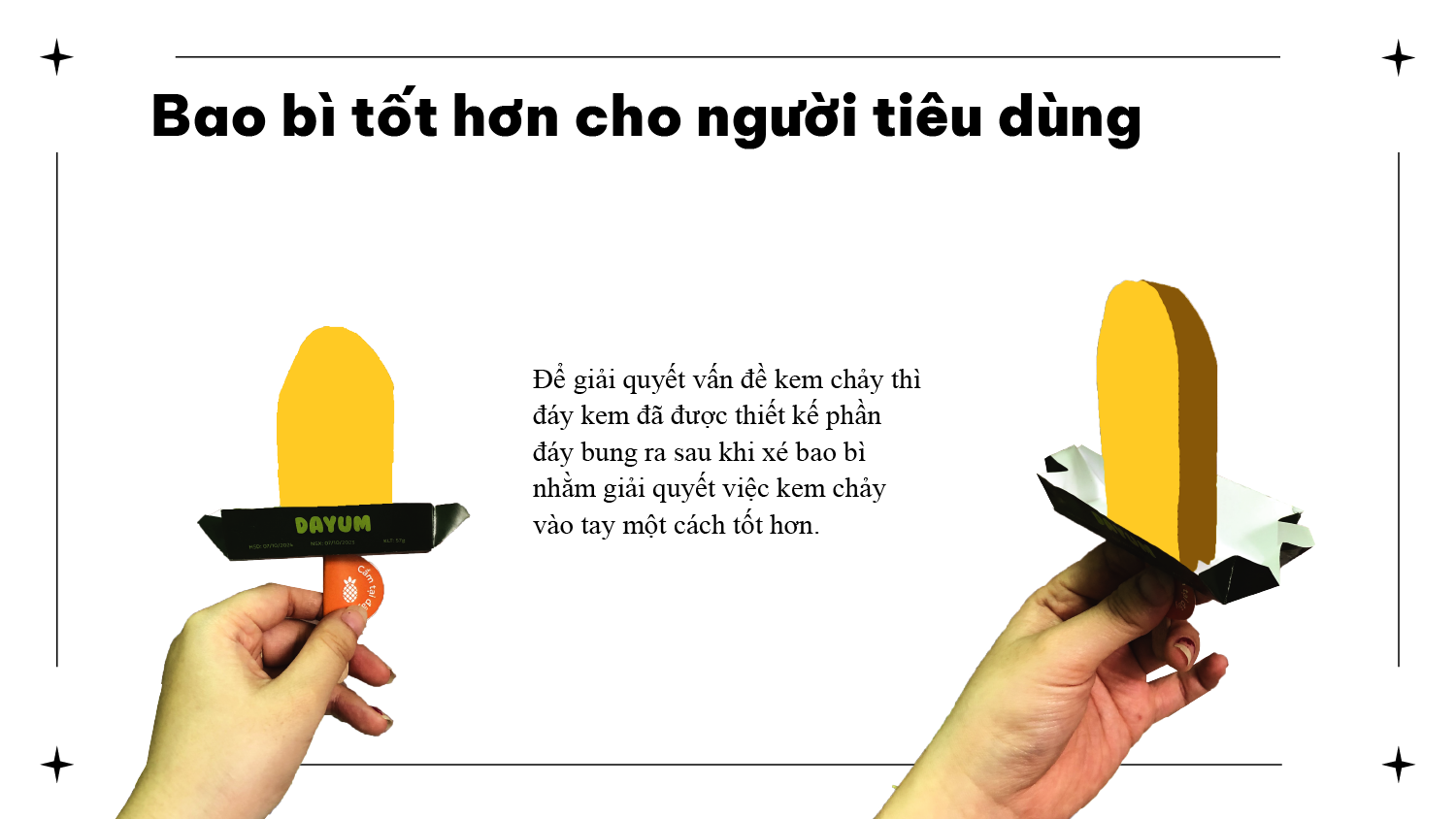 Để giải quyết vấn đề kem chảy thì đáy kem đã được thiết kế phần đáy bung ra sau khi xé bao bì nhằm giải quyết việc kem chảy vào tay một cách tốt hơn.