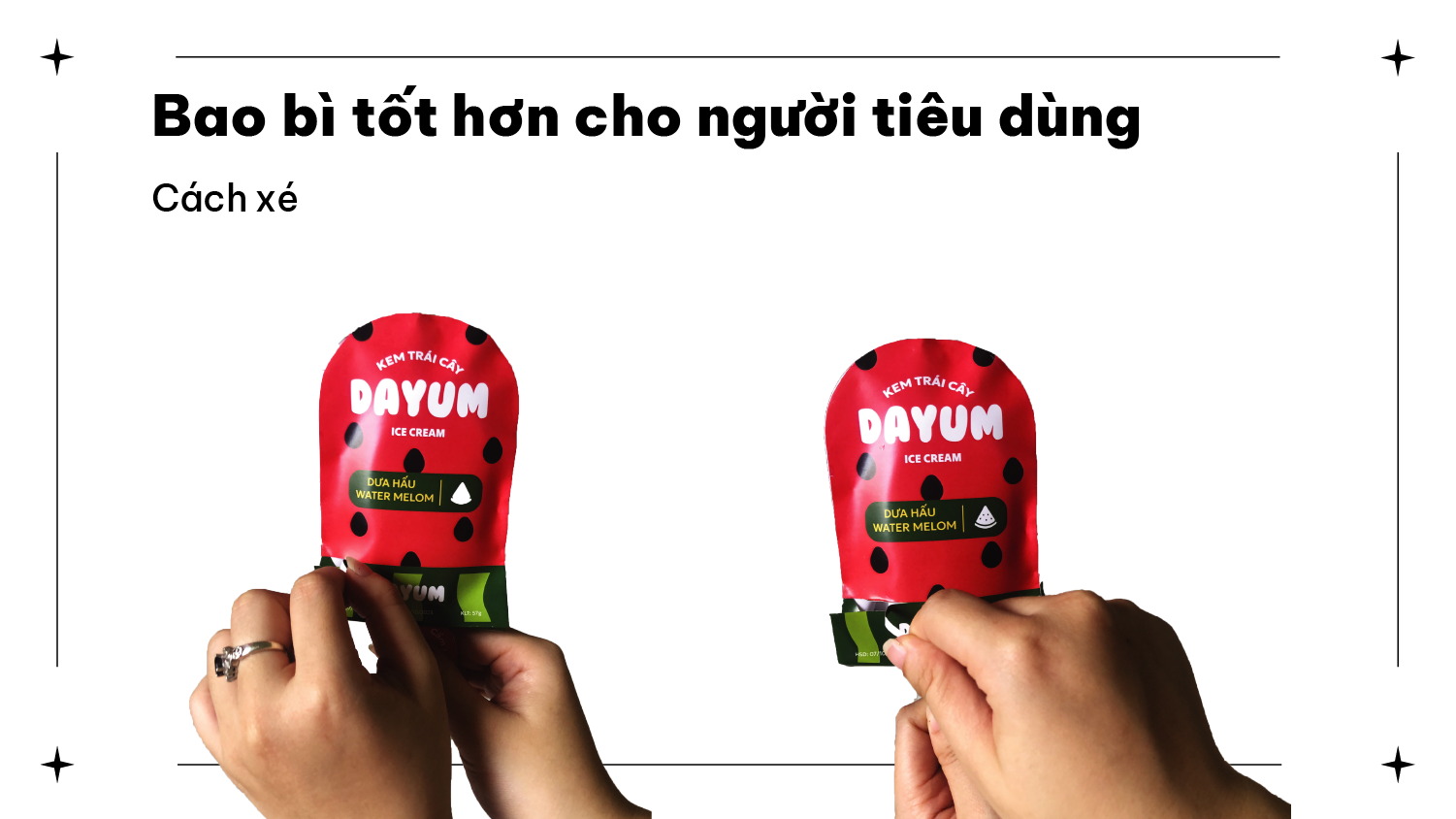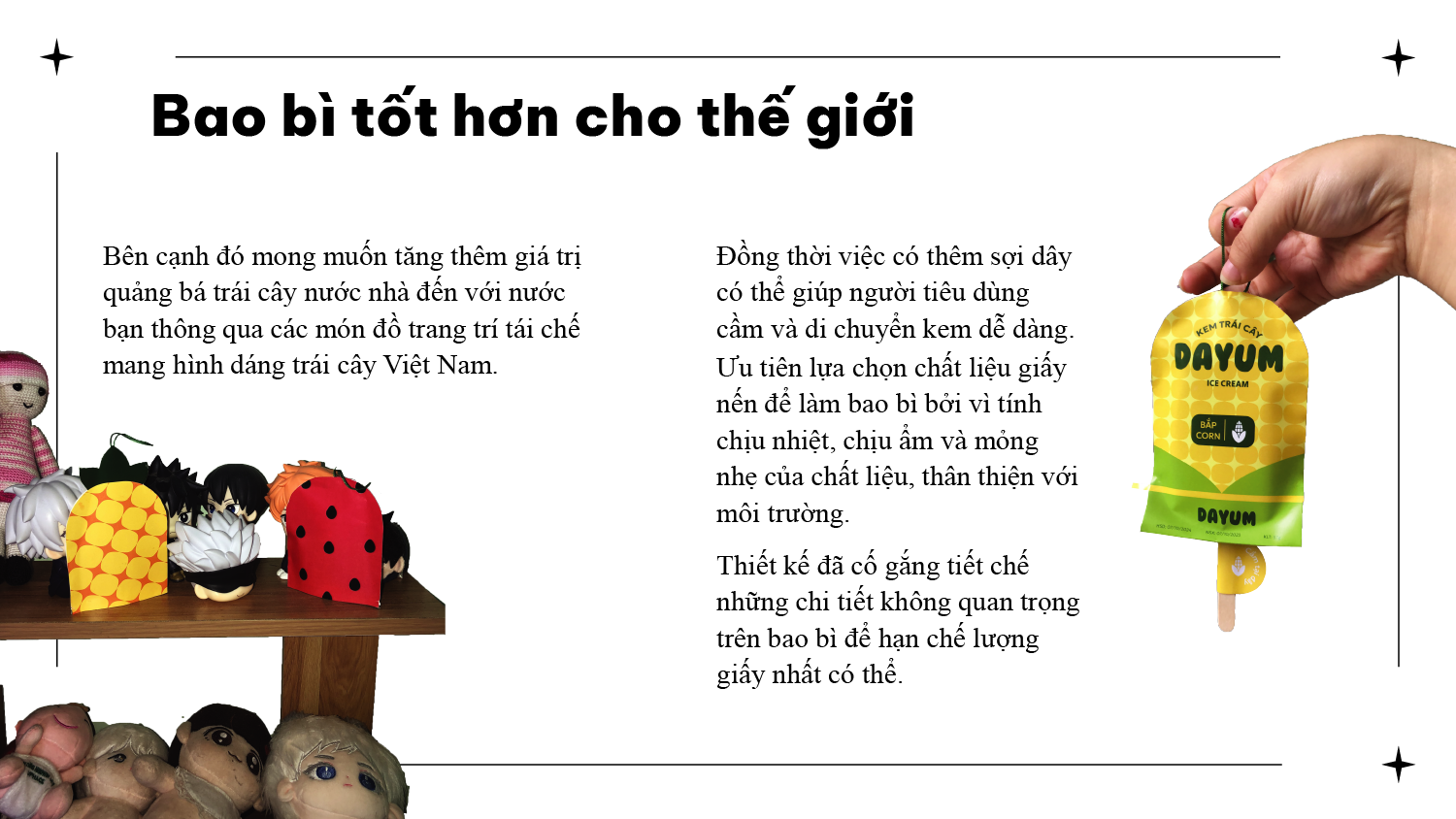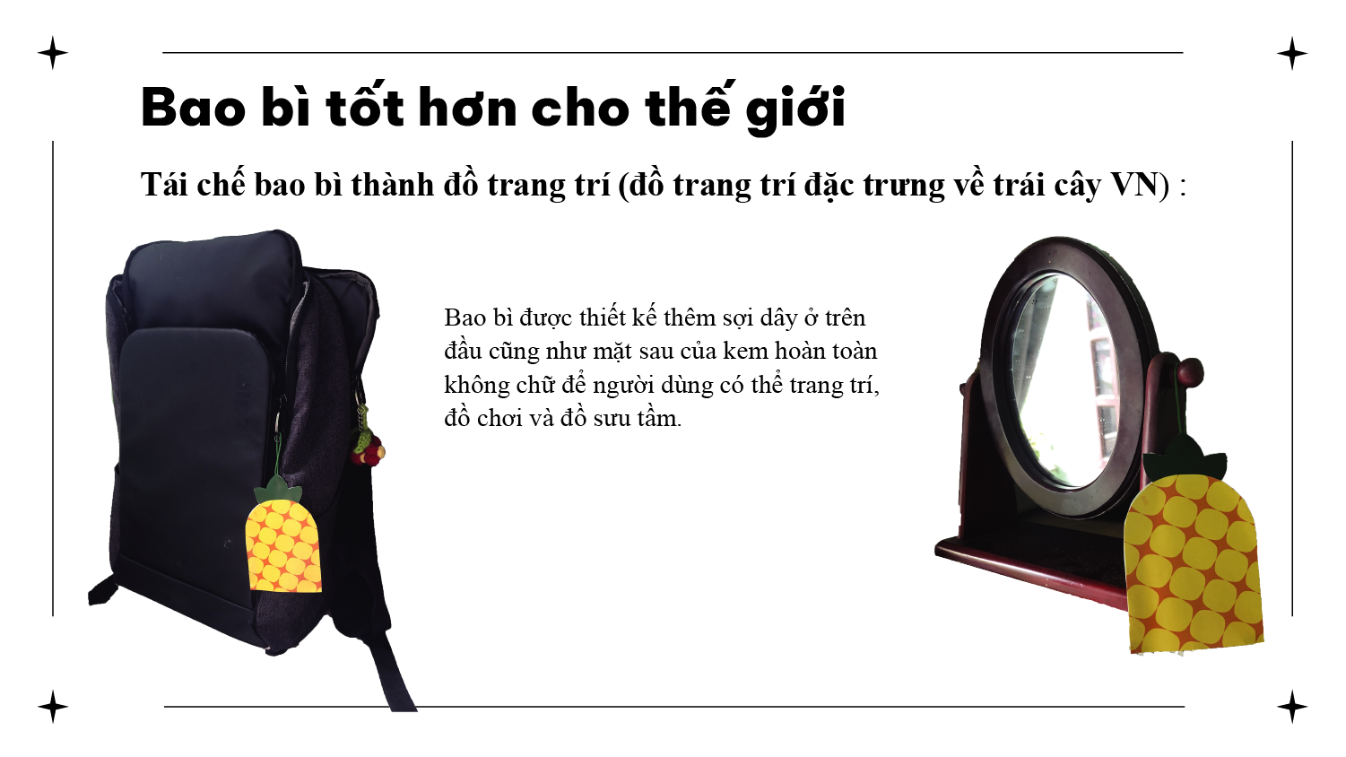 Tái chế bao bì thành đồ trang trí (đồ trang trí đặc trưng về trái cây VN) : Bao bì được thiết kế thêm sợi dây ở trên đầu cũng như mặt sau của kem hoàn toàn không chữ để người dùng có thể trang trí, đồ chơi và đồ sưu tầm. Đồng thời việc có thêm sợi dây có thể giúp người tiêu dùng cầm và di chuyển kem dễ dàng. Bên cạnh đó mong muốn tăng thêm giá trị quảng bá trái cây nước nhà đến với nước bạn thông qua các món đồ trang trí tái chế mang hình dáng trái cây Việt Nam