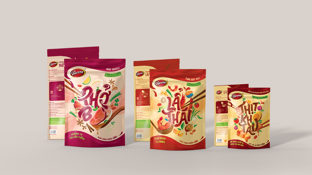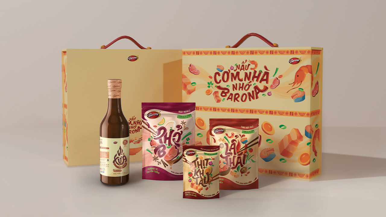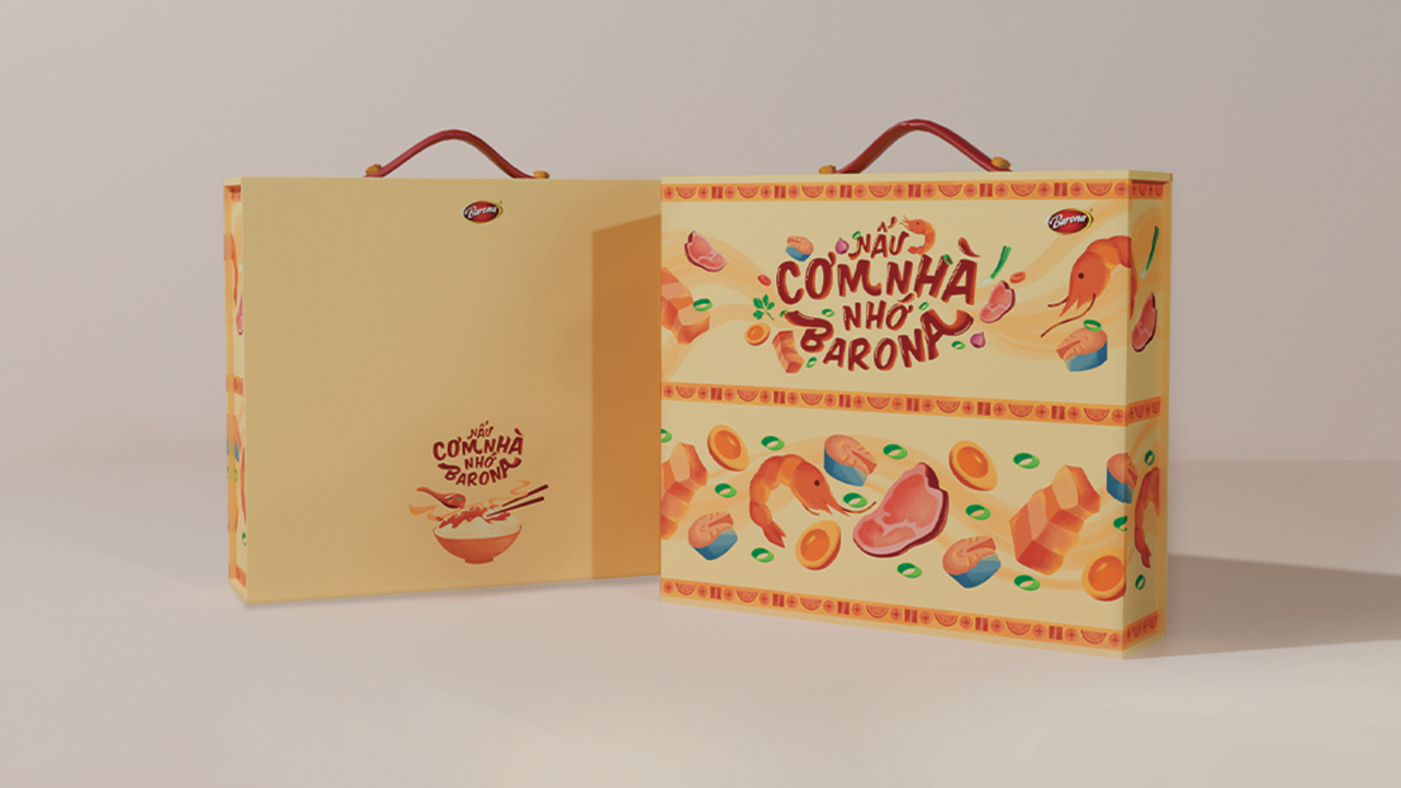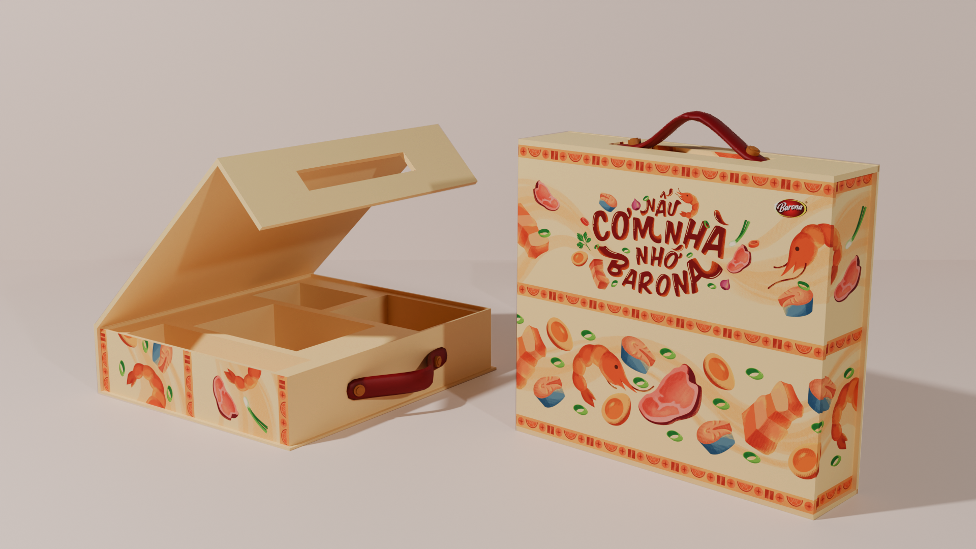 Để tạo sự tươi mới và tiếp cận với nhiều tệp khách hàng hơn, chúng em đã đổi mới thiết kế bao bì bên trong đồng thời đồng bộ lại hình ảnh cũng như là tạo mạch truyện liên kết các bao bì là bằng "đôi đũa" cũng như là cách điệu lại về phần chữ tiêu đề chính mô tả sản phẩm. Vui hơn, ngon hơn, bùng nổ cảm xúc hơn, đó chính là những điều mà chúng em hướng đến. Về phần bao bì cấp 2, được thiết kế và lấy cảm hứng từ chiếc cà mèn Việt Nam dùng để mang cơm đi học, đi làm, đi chơi,... còn nay là mang hương vị cơm nhà đi đến khắp chốn và gợi về hương vị mẹ nấu khắp gian bếp, nơi xa nhà. Dịp Tết cũng là lúc chúng ta quây quần bên nhau nhưng sẽ ra sao nếu một dịp Tết chưa thể về kịp, sẽ chẳng còn là Tết nếu thiếu bánh chưng và bánh tét và cũng sẽ chẳng thể là Tết nếu thiếu vị quê, vị cơm nhà, " Barona - chiếc cà mèn đồ ăn mang chuẩn vị mẹ nấu" sẽ đảm đương mang việc đấy, vừa ngon, vừa tiện và vừa lành. Đây là sẽ là một món quà tặng ý nghĩa cũng như là đông đầy vị cơm nhà trong gian bếp nhà bạn, là một chiếc cà mèn sản sẻ tình yêu thương, kết nối những trái tim người con xa nhà.